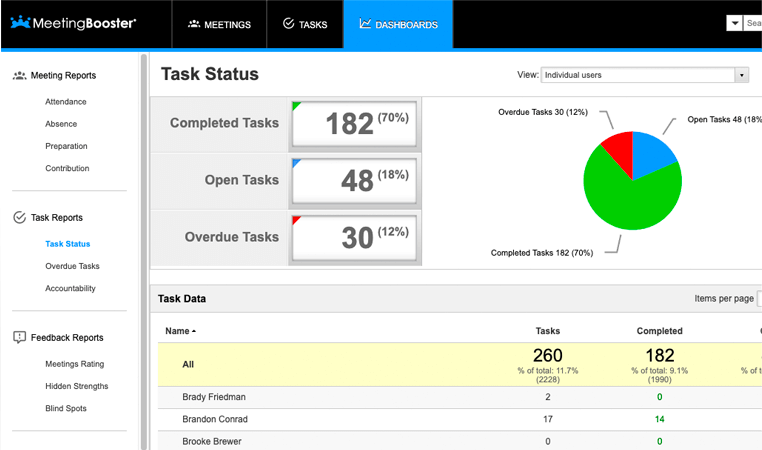 - Pre-meeting task assignment lets you assign tasks that need completion before meetings, with status tracking to hold attendees accountable